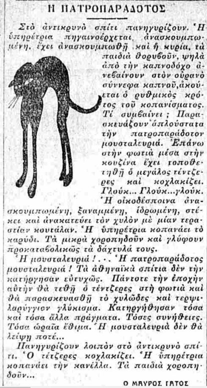 «Είνε κάμποσες ημέρες τώρα που η Αθήνα είνε ανασκουμπωμένη με τη φούρια μεγάλων προετοιμασιών. Θα ενόμιζε κανείς ότι λαμβάνει έκτακτα μέτρα κατά των επιδημιών. Βγάζει τα βαρέλια της, τα μεγάλα στεφανωτά ξυλοβάρελα, τα βουτσιά, τα βαγένια, τα ανεβάζει αδειανά από τα υπόγεια των καπηλειών έξω στο πεζοδρόμιο και τα καθαρίζει, τους αλλάζει τις σκεβρωμένες δουγές τους, τα σφυροκοπάει, και κάποτε τους κάνει κ’ ένα περίπατο έως το Φάληρο να τα ξεπλύνη καλά με την άλμη του θαλασσινού νερού.